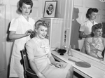 Miss Esther M. Miller having her hair dressed by beautician Ruth Christie. Image appeared in Star-Telegram Evening Edition April 19, 1944 with the following caption: "The bridegroom won't be present for her long-distant telephone wedding but Miss Esther M. Miller was "prettied up" by Beautician Ruth Christie anyway."