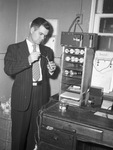 Price Griffith, chief of city sanitarians, is shown putting water in one of the new wet cell flashlight batteries he is using for rat control work beneath buildings. One of the cells is shown on the charger, which revitalizes the batteries each night. On the desk is a short shelf with flashlights and other supplies. Mr. Griffith is wearing a striped suite with patterned tie standing next to the desk. Published in the Fort Worth Star-Telegram morning edition, April 23, 1944.