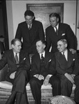 Advertising Federation of America 10th district. Seated, left ro right, Richard Hale, Shreveport; Julian Herndon, Little Rock, Rex Huguley, Oklahoma City. Standing, left to right, Leo J. Malone, Wichita Kansas, and Rowland Broiles, Fort Worth. Three men are sitting on a couch while two are standing up behind them.