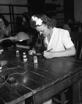 Geology students. Katherine Wittmayer. Published morning edition April 30, 1944. Photograph of a young woman sitting at a table. In front of her on the table is a microscope and she is looking into it. She has white flowers in her hair and is wearing a white blouse. There are some clear glass bottles on the table with some substance in them. A lamp is also on the table.