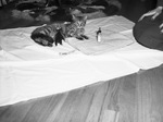A cat and with a baby Boston bulldog, owned by H. F. Mitchell. The 6 day old Boston bull puppy, orphaned by the death of it's mother, has been taken over by Puss, the cat. The small puppy is nursing while the cat lays on a table. There is a small bottle of milk next to the cat.