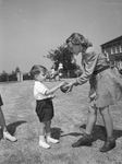 Girls Scouts at Nursery School. Martha Jean Blanton playing ball with Anthony Leggio, 2. The two are shown outside on the school's playground, as Miss Blanton hands Anthony a ball. Anthony is wearing a pair of shorts and shirt, while Miss Blanton is wearing a belted dress that has buttons down the middle. Behind them, other children can be seen playing on a see-saw. There is also a fence that borders the perimeter of the playground.