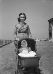 Girls Scouts at Nursery School. Walking the baby is Dorothy Miller. 10. The baby is Diana Loughry. Miss Miller is shown pushing a baby stroller that contains the young Diana, near the nursery school. Miss Miller is wearing her Girl Scouts uniform which includes a belted dress that has buttons that run down its middle. She's also wearing a small, dark hat. Young Diana is wearing a small dress and baby bonnet. She also has a few blankets on her lap.