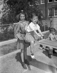 Girls Scouts at Nursery School. Wanda Faye Balch, 11, and Patricia Fay Rowland.Miss Balch is shown giving balance to the enthusiastic see-sawing of Patricia. She stands behind young Patrica, holding the underside of the see-saw up, while Patricia holds on to the handle. Miss Balch is smiling while dressed in her girl scout uniform. Patricia is wearing a pleated skirt and blouse. Both girls are smiling widely. Behind them is another child playing on the see-saw and the fence that borders the playground.