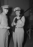 Lieutenant Colonel W. H. Crawford, commandant of the Eighth Service Command, left, and Major H. W. Roberson, Fort Worth, Texas, provost marshal, inspecting one of the guns used by the MP's. The men are wearing their military uniforms. Lieutenant Colonel Crawford is turned toward Major Roberson. He has on eyeglasses and is holding an unlit cigarette. Published in Fort Worth Star-Telegram, morning edition, April 27, 1944.