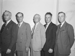In attendance at the "Big Four" Railway Convention were left to right, W. M. Conway, J. H. Vallee, Sam Lewis, Leon Krus, and H. L. Reynolds. The trainmen and engineers elected officers at the convention. Mr. Conway of Fort Worth, Texas is wearing a double breasted pinstripe suit. He was re-elected chairman. Mr. Vallee of Wichita Falls, Texas is dressed in a double breasted suit. He was named secretary. Mr. Lewis, Amarillo, Texas, is wearing a light colored suit. He was elected first vice chairman. Mr. Krus of Houston, Texas is wearing a dark suit. He is the executive committeeman. Mr. Reynolds is dressed in a three piece suit. He was re-elected second vice chairman.