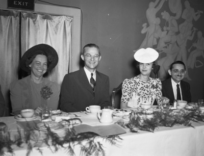 Fair store banquet. Honoring Bevan. Left to right, Mrs. Mack Pegues, Mack Pegues and L. R. Sarazen. They sit at a long table for a dinner, smile and pose for a picture. Published on May 16, 1940.