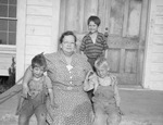 Mrs. D. M. Doyle is a missionary. She cleared the bottles and cobwebs out of an abandoned saloon to establish the interdenominational Doyle Bible Mission, after she found not a single church in the area West Seventh to White Settlement, and from Trinity River to the railroad. Helping Mrs. Doyle in the venture were workers from the Doyle Bible Class of Arlington Heights Methodist Church, which she has taught for about 20 years. There was a vacant lot, across the street from the only lights and water in the community, was given to them and a church erected on the site. The first services in the new building were held on Pearl Harbor Day. The church was paid for Easter, 1943. By an agreement with the tax office, the lots will be held until the church can raise the money. By Christmas, $600 had been collected for a boys' building, soon to be erected. Kiwanis Club has adopted the boys and girls of the Doyle Bible Mission, and are furnishing two trained welfare workers from YWCA and YMCA. The boys have been selling war stamps, and now have a project to lay walks around the church, while the girls' project is the planting of flowers. For the first time, these children from one of the city's high juvenile delinquency areas have the opportunity to enjoy Christmas parties, Easter Egg hunts, picnics and a weekly club of their own. In this picture, Mrs. D. M. Doyle and children she has helped, left to right, Billy Wayne Worton, in dirty overalls and shirt, with messy hair and dirty face and hands, Tommy Worton, in an over sized striped shirt and pants, and Maxie Sanders with dirty overalls and shirt with dirt on his face is dressed in a three button, belted, dress with a flower pin attached to the v-neckline, round earrings and round eye glasses. They are all, except Tommy who is standing, sitting on a front porch, of a wooden house, in front of a double door. Published in Fort Worth Star-Telegram, morning edition, May 7, 1944.