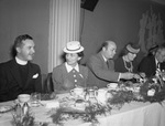 Fair store banquet. Honoring Bevan. Left to right, Reverend Sherwood Clayton, Mrs. Chester Fite Junior, Mr. Fite, and Mrs. R. M. Bowen. They are eating dinner at a long table. Published on May 16, 1940.