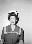 Miss Karen James, secretary and translator for Foreign Economic Administration in Peru and Bolivia. Miss James is wearing a dress with a very wide collar. She also has a bow in her hair.