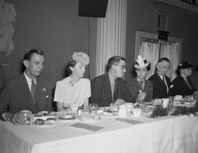 Fair store banquet. Honoring Bevan. Left to right, J. E. Thompson, Mrs. Thompson, Roy Ficke and Mrs. Ficke. They are eating dinner at a long table. Published on May 16, 1940.