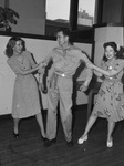 Service Men's Center (S.M.C.) Miss Maxine Middleton, left, and Miss Betty Ann Purser, right, S. M, C, hostesses attempting to show Private James Harold Shivers around the center. Two girls tugging on either side of the man in the middle.