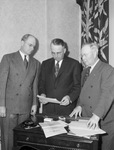 Texas Motor Transportation Association. Left to right: M. J. Neeley, Ernest Allen and Ed Sproles. The trio of men are standing behind a wooden desk that is covered with a few scattered papers and two cigarette boxes. Mr. Allen appears to be reading from the documents he is holding, while Mr. Neeley and Mr, Sproles look on. They are all dressed in textured suits, however Mr. Allen's is the darkest. Behind them is a wall with a patterned banner hung up.