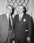 Lions Club convention. Joe E. Childers (left) of Abilene, Texas and Joe Williamson of Abilene, Texas. The two stand next to each other, both smiling at the camera. Both are wearing suits and patterned ties. Mr. Childers' suit jacket is open while his companion's is double breasted and buttoned up. Mr. Williamson also has a badge pinned onto the lapel of his suit. Behind them is a door with a metal cross hatching design on it.