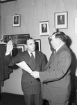 Cavett S. Binion, left, sworn in as Assistant Federal Attorney by Clyde Eastus. Both two men are raising their right hands. Mr. Eastus is holding paper in his hand. On the wall behind the two men are portraits of people.