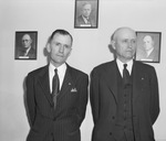 Kiwanis Club. G. A. Coxie Stark (left) of Oklahoma City, Oklahoma and J. R. Holley of Brownwood, Texas. The two men are standing in front of a wall that has three framed pictures of men hung up. Both men are wearing suits and have their hands behind their back. The club came together to urge congress of the use of the bill of rights and the constitution as "supreme law of the land".