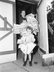 Richard Cassidy, 3, and John Arlis Cassidy, 8, are shown with their mother, Mrs. John M. Cassidy, carrying large stacks of waste paper out of their garage at 3232 University Drive for the Texas Christian University (TCU) curb collection. Richard is wearing a shirt and shorts and John Arlis is wearing trousers. Mrs. Cassidy is wearing eyeglasses. Published in The Fort Worth Star-Telegram evening edition May 5, 1944.