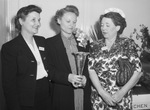 Mrs. Max Farmer (center), 2219 Lincoln, holds silver cup awarded to her as sweepstakes winner of North Side Garden Club's Spring Flower Show at Rock Wood Park. At left is Mrs. Jesse Martin, White Settlement Road, president. At right is Mrs. E. W. Shine, 5015 Black Oak Lane, chairman.Mrs. Farmer is wearing a long jacket with long sleeves, with name tag and large corsage. She is wearing a checkered dress that ties at the neck. Mrs. Maritin is wearing a dress suit with name tag. She has on v-neckline blouse and clip on earrings. Mrs. Shine is wearing a flower pattern dress with short sleeves and belt around waste. She has on a name tag and a clutch purse under her arm. Mrs. Shine is wearing dangle earrings and a pillbox hat. Published in Fort Worth Star-Telegram, morning edition, May 7, 1944.