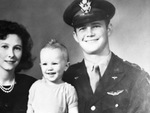 Lieutenant Joseph W. Johnson, 24, killed in B-24 crash in Smyrna, Tennessee. The photograph shows Lieutenant Johnson smiling in his military uniform with his son, Joseph W. Johnson Junior on his lap. Next to him is his wife, the former Miss Carol Rogers.