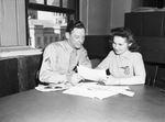 Checking alumni of the Lena Pope Home on a world map left to right are, Corporal Don Thompson, president of the Lena Pope Home Alumni Association, and Margaret Anne Dawson, secretary. Corporal Thompson is stationed at Roswell, New Mexico at the Army Air Field. He is dressed in his military uniform. Miss Dawson is a junior at Texas Wesleyan College. She is wearing a blouse with embroidery on the pocket. Corporal Thompson's sunglasses and side cap are sitting on the table along with a stack of papers.