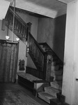Interior view of former home of Doctor (Dr.) W. B. McKnight at Mansfield, Texas, built about 1870, is considered a landmark. It will soon turn into a funeral parlor. Photograph of the entry way inside the home. There is a three level staircase. The steps have a pattern rug. Up against the stairs is a long, wooden, bench with a floral cushion. On the wall, next to the bench, is a wooden, crank style, wall phone. Published in The Fort Worth Star-Telegram morning edition, May 7, 1944.