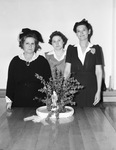 Oaklawn Garden Club flower show sweepstake winner, Mrs. Ira C. Harris (left), 3002 Mecca, with her Mrs. R. E. Barr (center), chairman of the show, and blue ribbons winner Mrs. A. M. Tallmon (right). All three women are shown standing behind a table displaying the award winning arrangement. The flower arrangement is in a large, criss-cross pattern, dish. In the center is a porcelain figure of a geisha girl. Mrs. Harris is wearing a belted dress. The long sleeves and v-neckline are trimmed with open design material. Where the neckline meets is a large brooch. She is wearing rimless eyeglasses and a veil half hat. Mrs. Barr is wearing a gingham pattern dress with v-neckline. Her blouse has large collar. Mrs. Tallmon has on a belted dress with full length pleats, puffed short sleeves, v-neckline to waist, button blouse, and a rose pinned on the dress. Published in The Fort Worth Star-Telegram morning edition, May 7, 1944.