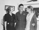 Left to right, Mrs. Grady Helm, mother to Grady, Senior Staff Sergeant. Grady Helm, and Mrs. Ellen Milburn, grandmother. Mrs. Helm is wearing a belted dress with collar, puffed short sleeves, pockets on chest and hips. There is a tissue in one of the pockets. She is looking towards her son, Grady. Senior Staff Sergeant Grady Helm is wearing his United States Marines uniform, He is looking towards his grandmother, with a big smile. He has his arms around both his mother and grandmother. His grandmother, Mrs. Ellen Milburn, is wearing a cardigan over a paisley dress. She is smiling at her grandson. Behind them are flowers on a table, framed picture above them, and beveled mirror on other wall. Published in Fort Worth Star-Telegram.
