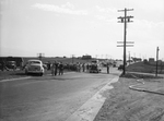 Traffic on U. S. Highway 80 during the fire at the Western Wholesale Lumber Company building. Numerous cars are backed up along the road and various unidentified people are standing outside their cars and in the road. Alongside the highway are telephone poles. Published in Fort Worth Star-Telegram, morning edition, May 8, 1944.