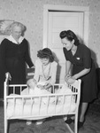 Four generations seen surrounding the seventy year old cradle. Seen left to right, is Mrs. B. D. Howard of Tyler, great grandmother; Mrs. Alex A. Abbott, mother, and Mrs. Oscar H. Cresswell, grandmother. In the cradle, is Alex Villarent Abbott Junior. Mrs. Howard is in a belted dress with v-collar, brooch in center, and eye glasses. She has one hand on the back of a chair and the other is resting by her side. She is looking down at her great grandson. Mrs. Abbott is leaning over the cradle and holding the baby partially up. She has on a dress with a large shell necklace. Mrs. Cresswell is leaning over with hands on the cradle. She is making eye contact with her grandson and smiling. She has on a short sleeve dress with a scarf pocket square. Alex Villarent Abbott Junior is in a long sleeve gown. He is staring at his grandmother. Published in Fort Worth Star-Telegram.