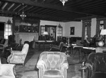 Internal shot of Fort Worth Club building. In the photograph are exposed wood beam ceilings, with chandeliers hanging, velvet chairs, and tables shewn about the room. There is a brick fireplace with ornate frame. On top of the mantle, are a clock and candlestick. Above these items, is a large painting. Formal drapes adorn two windows. A painting of a woman hangs next to open french doors. Various lamps are placed on tables, along with books, newspapers, candlesticks, and a world globe. Between the two windows, sits a man, in a suit, reading a newspaper. Published in Fort Worth Star-Telegram.