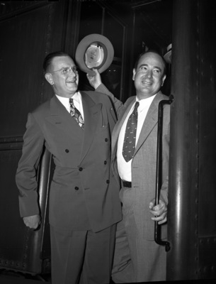 Fort Worth, Texas, delegation members, Normand K. Patton, left, and Ed Ernest, waving goodbye as they left for the West Texas Chamber of Commerce (WTCC) convention in Big Spring, Texas. They are standing on the entrance steps of a railroad train. Patton is wearing a double-breasted suit and eyeglasses. Ernest is wearing a suit and is holding at hat in his right hand.