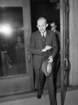 Otis Rogers, lawyer, is walking out of a doubled glass door with handles; his right hand up in front of him and left hand wearing a ring on his ring finger. He is holding a fedora hat. Mr. Rogers is in a three piece, pinstriped suit with striped shirt and tie. Behind him, are people sitting on long benches, unassumingly, a court room. There is a man behind Mr. Rogers. The flooring is hexagonal tile.