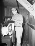 P. A. Key, wires a new electric motor for the courthouse clock. Mr. Key is standing beside a motor with large gears.