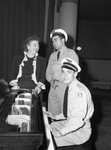 Miss Addeleen Wallace, left, Service Men's Center hostess, learns the lyrics to a French song from two French Air Force pilots visiting Fort Worth. Henri, standing, explains the words while Jean plays the piano. Miss Wallace is wearing a dress and a coat with ruffled trim, and the pilots are wearing their uniforms. The pilots' last names were not identified for military security reasons. Published in the Fort Worth Star-Telegram morning edition, May 13, 1944.
