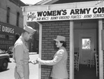 Lieutenant George J. Volts and Sergeant Gilbreth making an exchange. They are standing in front of a building with a sign that says "Join The Women's Army Corps". Both are wearing military uniforms.