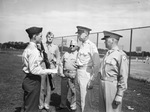 Reserve Officer's Training Corp (ROTC) inspection. Left, ROTC Staff Sergeant Lee R. Rogers, Captain Thomas F. Butt, assistant and Colonel C. L. Caphton, Fort Worth ROTC head; Major R. L. Roberts, and Major Chris Solberg, ROTC commandant in Guthrie, Oklahoma. Staff Sgt. Rogers is holding a rifle. The other four men are wearing military uniforms and appear to be inspecting Sgt. Rogers and the rifle.