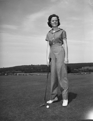 Tarrant County Home Demostration Club cotton style show. Miss Janice Duke, daughter of Mr. and Mrs. T. H. Duke of Everman, modeling a green slack suit for golf. She is standing holding a golf club. Published on May 17, 1940.