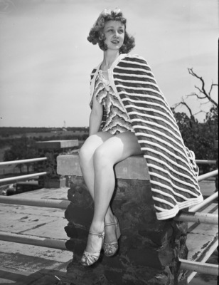 Tarrant County Home Demonstration Club cotton style show. Miss Charlotte Allison, daughter of Doctor and Mrs. H. C. Allison of Smithfield, modeling a blue print bathing suit and beach cape. Published on May 17, 1940.