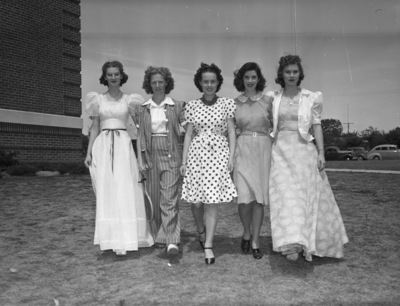Polytechnic High School style show. Left to right, Jane Wand, Katherine Young, Eva Louis Cochran, Paige Tankersley and Marjorie McCracken. These students are ready to spend their Summer vacation dancing, playing and shopping. They are wearing the garments they made during the school season in their clothing classes. The girls modeled their creations last week in a style show in the school auditorium. They stand outside and pose for a picture. Published on May 23, 1940.
