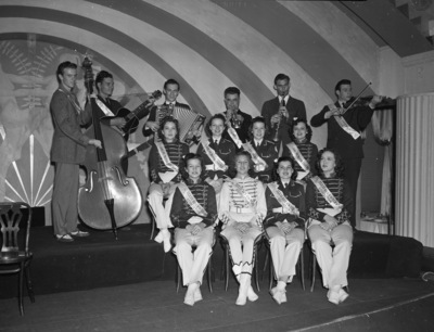 The Stephen F. Austin State Teachers College band is playing at the Blackstone Hotel. The Texas Motor Transportation Association is holding a three-day convention at the hotel. The band members are, left to right, front row, Olene Simmons, Deana Selden, Judy King, and Francine Hill. Second row: Helen Crawford, Sarah Ann Metteuer, Ozella McRae, and Doris Massey. Back row: Red King, Lesta Shackleford, J. T. Cox (director), Hubert Reavis and Howard Johnson.