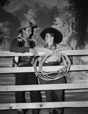 Eurie Miller (left) and Marion Ringler will furnish special entertainment to be presentation at the J. P. Elder Junior High School auditorium under the auspices of the Circle Park Parent Teacher Association. The entertainers pose in a stage setting. A wood fence stands in frond of them and a classic painted background is behind. They are both wearing "Western wear" with cowboy and cowgirl clothing. Ms. Ringler holds a lariat in her hands. This photograph was published in the May 20, 1940 evening edition of the Star-Telegram.