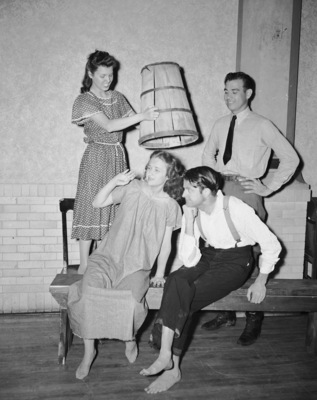 Some of the feuding Tollivers and a city feller who take leading parts in the Footlite Club's presentation of "trail of Lonesome Pine" Friday night at First Methodist Church. Left to right, La Dean McGrew, as June Tolliver; Billy Jo Roberts, Loretta Tolliver; Weldon Purcell, Bub Tolliver, and standing back, Ralph Lowe, the city feller from "up North." Roberts and Purcell are seen sitting on a bench, as Lowe and McGrew stand in the back. McGrew, feigning anger, holds a trash bin over Roberts' head, who acts distraught. Lowe looks on, smiling.
