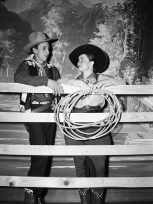 Eurie Miller (left) and Marion Ringler will furnish special entertainment to be presentation at the J. P. Elder Junior High School auditorium under the auspices of the Circle Park Parent Teacher Association. The entertainers pose in a stage setting. A wood fence stands in frond of them and a classic painted background is behind. They are both wearing "Western wear" with cowboy and cowgirl clothing. Ms. Ringler holds a lariat in her hands. This photograph was published in the May 20, 1940 evening edition of the Star-Telegram.