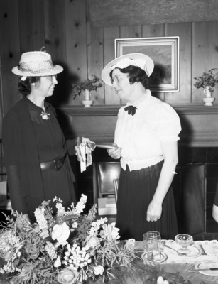 Art Club. Left to right, Mrs. C. J. Young, retiring president is handing the gavel of responsibility to Mrs. J. G. Lanier, the new president. Both are standing next to a reception table.