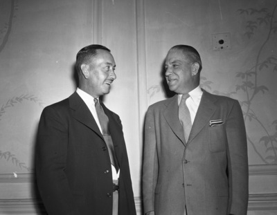 Lieutenant Colonel R. C. Throckmorton, left, retiring district commander of the Civilian Conversation Corps, and his successor, Major Julian Dayton. They stand next to each other having a casual conversation. Published on May 21, 1940.