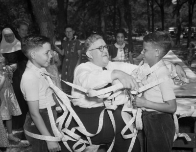 Catholic Orphans. Picnic. Joe Eddy Burks and Jack Ralston, Dunn Memorial Home, Dallas, got all the merry-go-round rides tickets they wanted Tuesday when children from two Dallas Catholic schools were entertained with a picnic and outing in Forest Park. Published on May 22, 1940.
