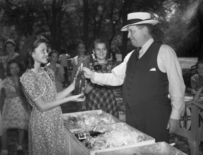 Catholic Orphans. Picnic. Judge Dave Miller, Barbara Parr and Rose Mary Elder, Dallas. He hands the girl a soda bottle.