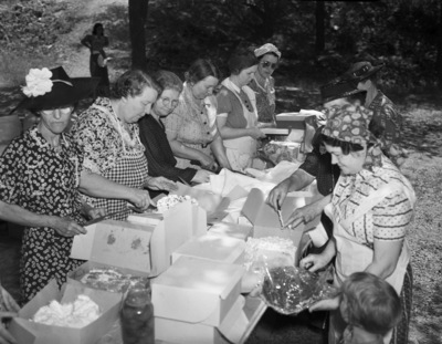 Catholic Orphans. Picnic. Women gather at the long table and prepare sandwiches for kids.