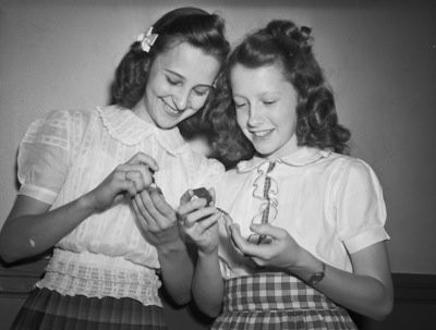Sue Moore, daughter of Mr. and Mrs. R. O. Moore, left, and Peggy Lewis, daughter of Mr. and Mrs. G. E. Lewis, both are inspecting the W. C. Stripling scholarship medals they were awarded in assembly. Both made straight A's, and made the two highest grades on an examination given 10 students to break a tie for the high grades in all classes to win the annual awards. Published on May 22, 1940.