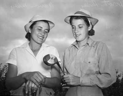Southern Women's Golf tournament. Left to right, Marion Miley and Dorothy Kirby, looking at a golf club.